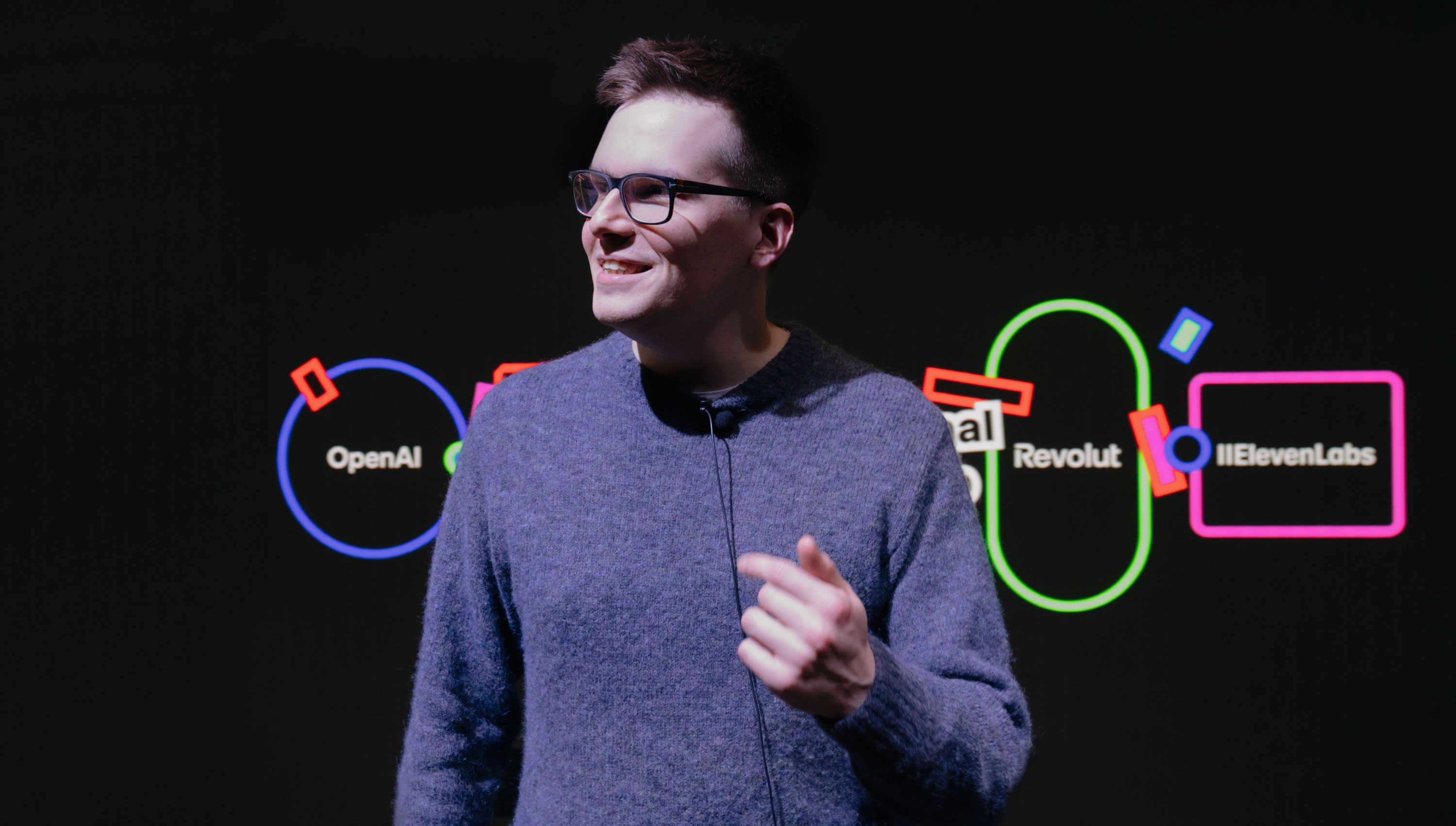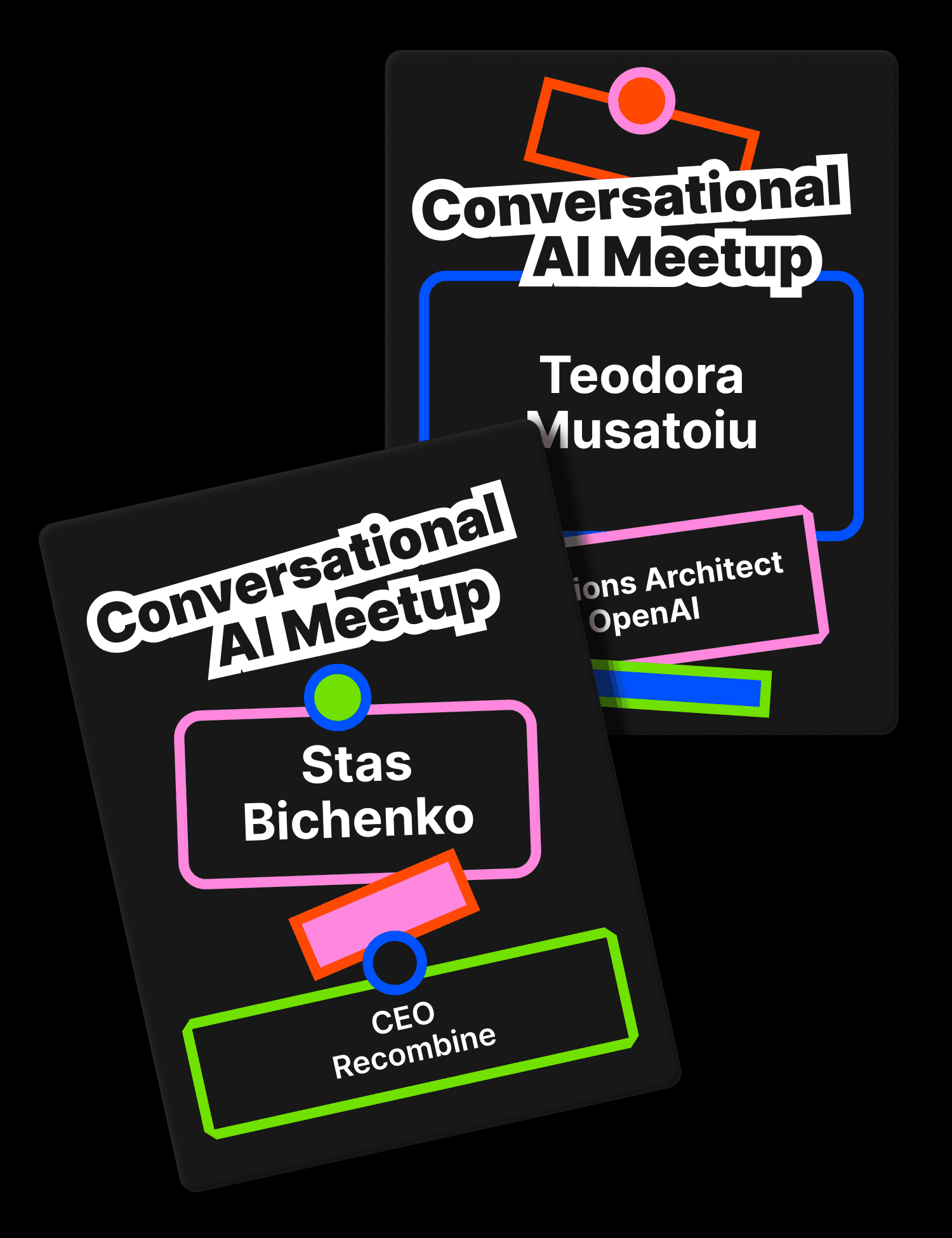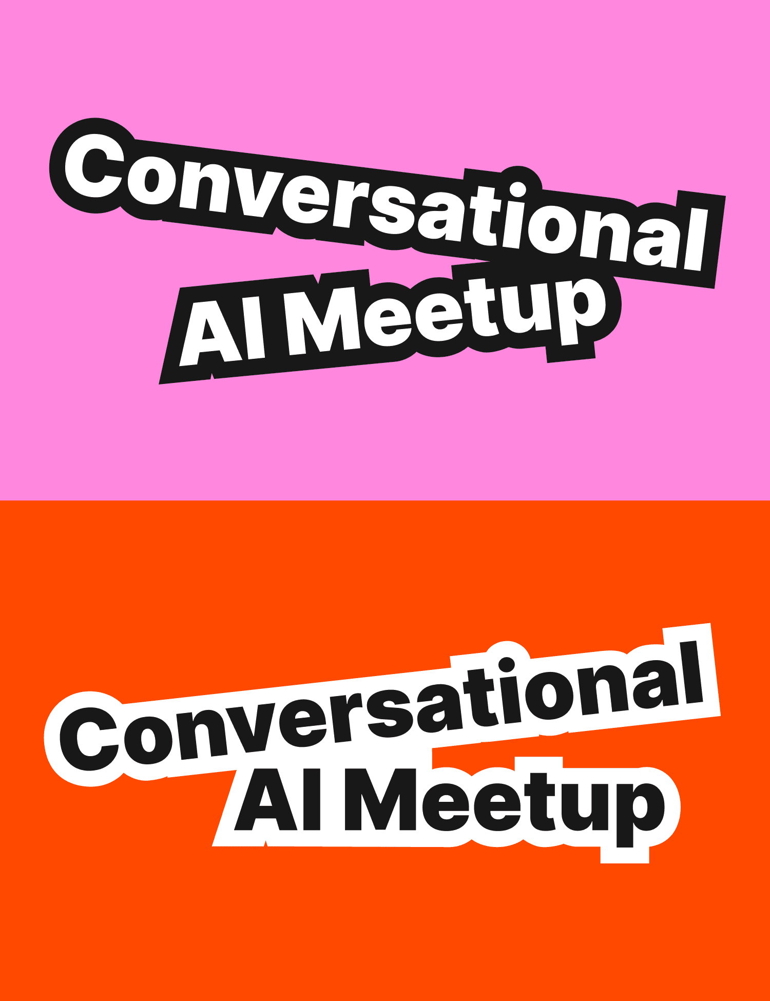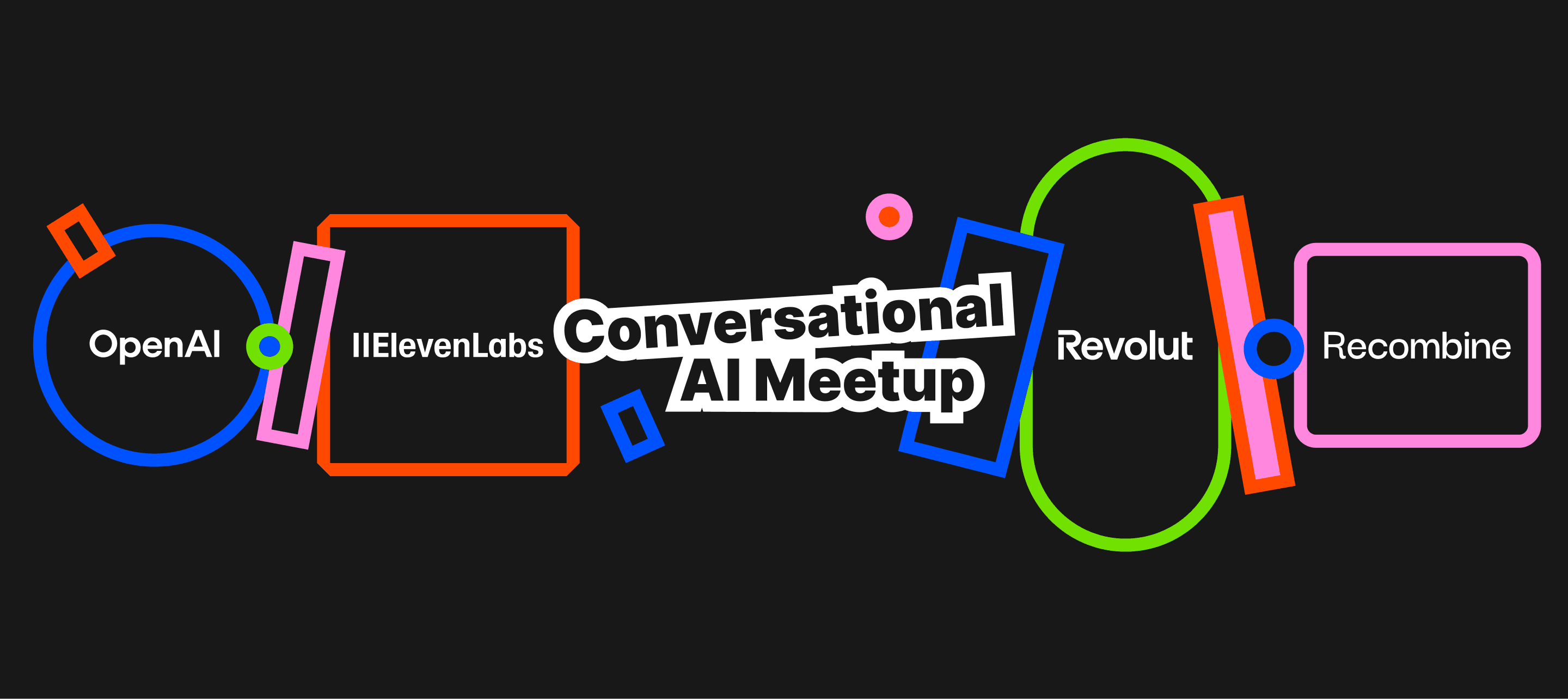Visual identity for a Conversational AI meetup at Revolut’s London HQ, where teams from OpenAI, Revolut, Recombine and ElevenLabs shared real-world AI practices.