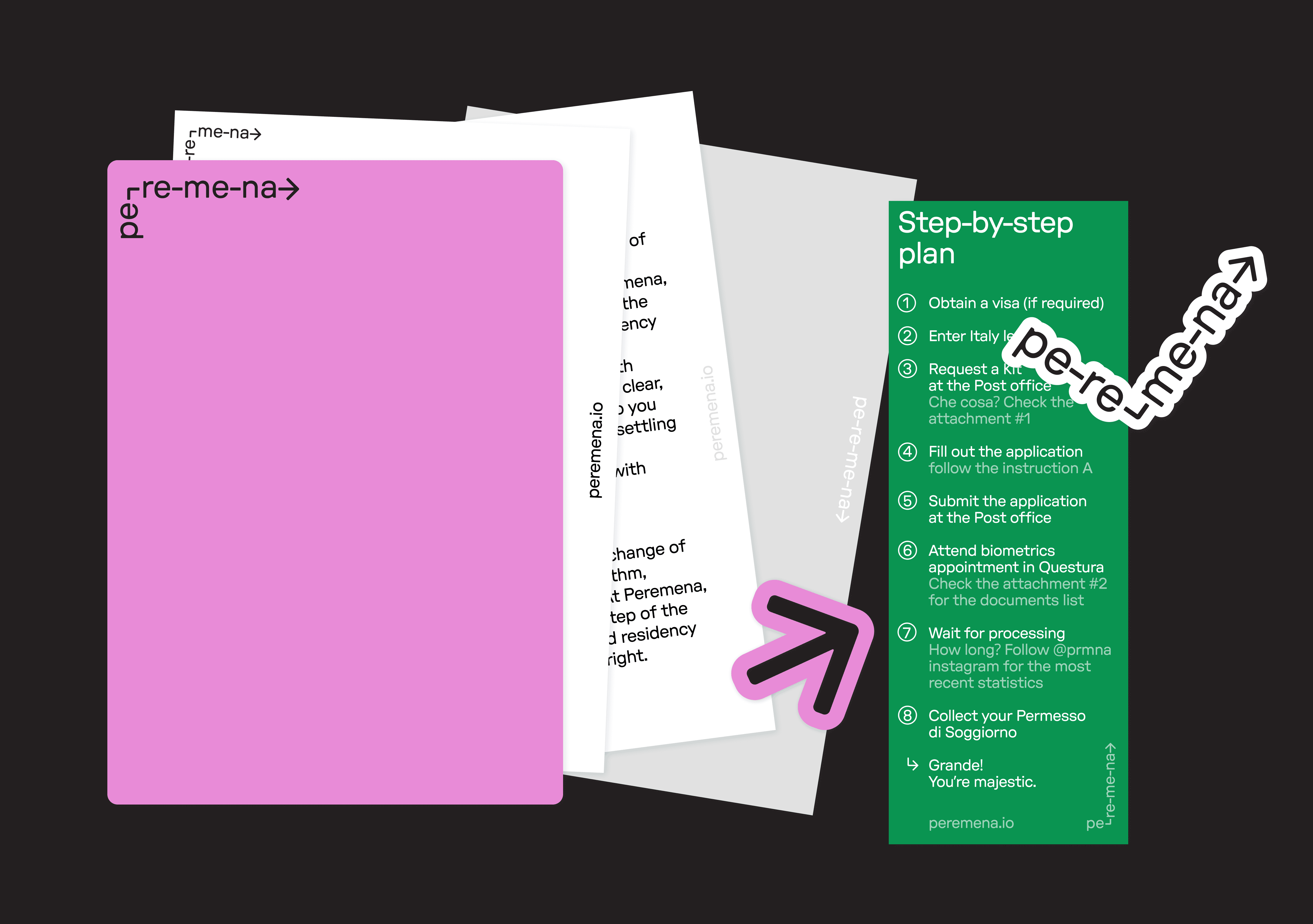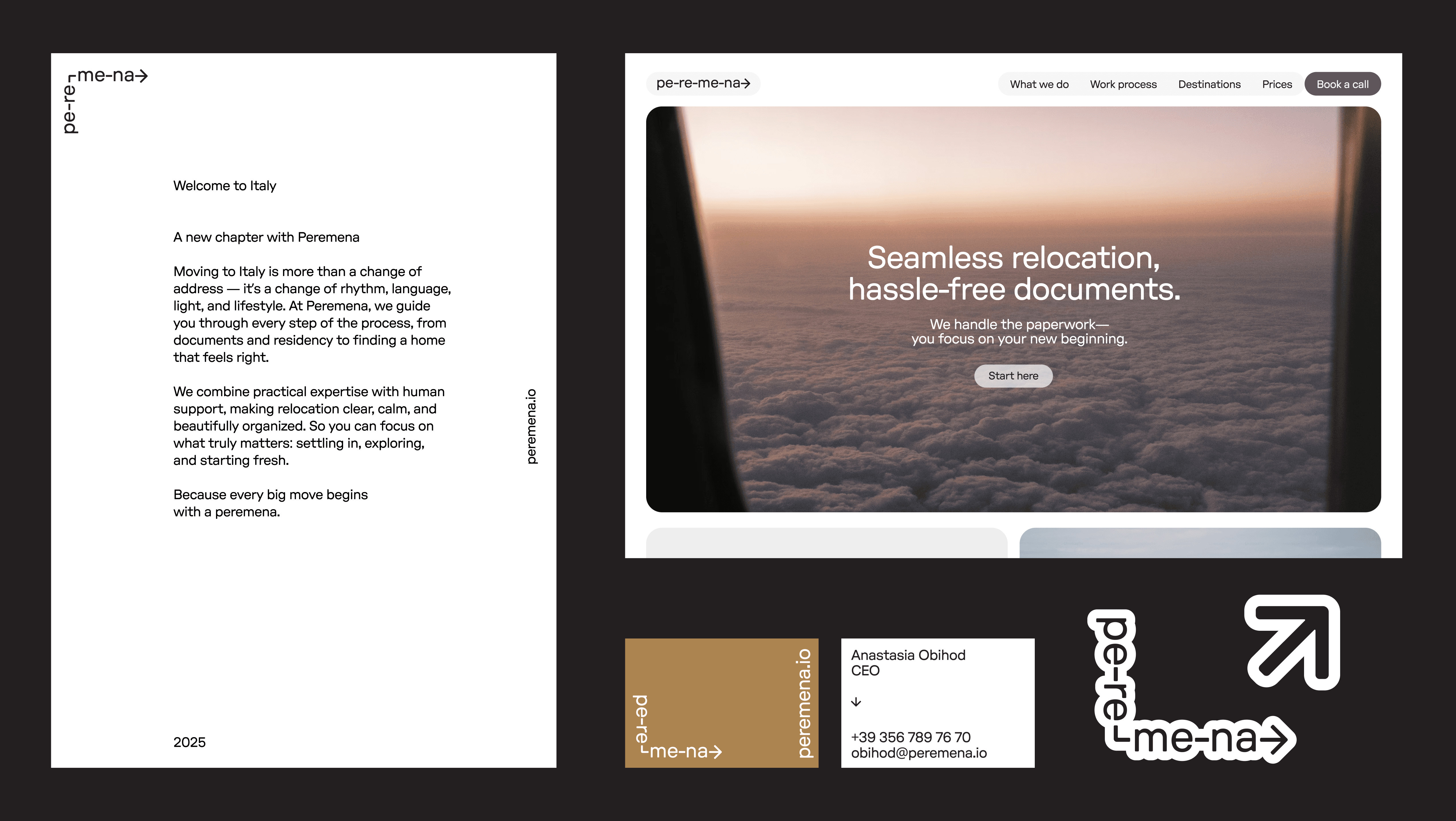 Peremena is a relocation agency helping people move to Italy. The name means “change,” carrying the feeling of transition—moving, shifting, starting over. The identity is built around points and arrows that turn complex and confusing process of relocation into a structured, manageable stages. Step by step, syllable by syllable.